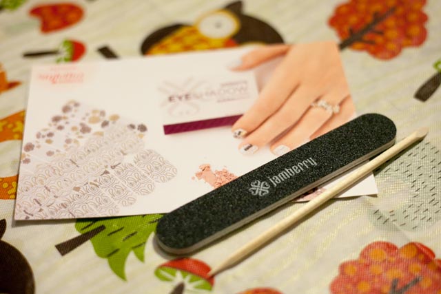 in Jamberry's own words: "Go bold in all-over gold! This month’s StyleBox is all about the details. Featuring modern deco detailing, these metallic, mixed-metal designs will you have you party ready in no time! Each StyleBox comes with a BONUS eye shadow to complete your holiday look! So whether you’re classic or trendy ‘All In The Details’ is a season must-have."